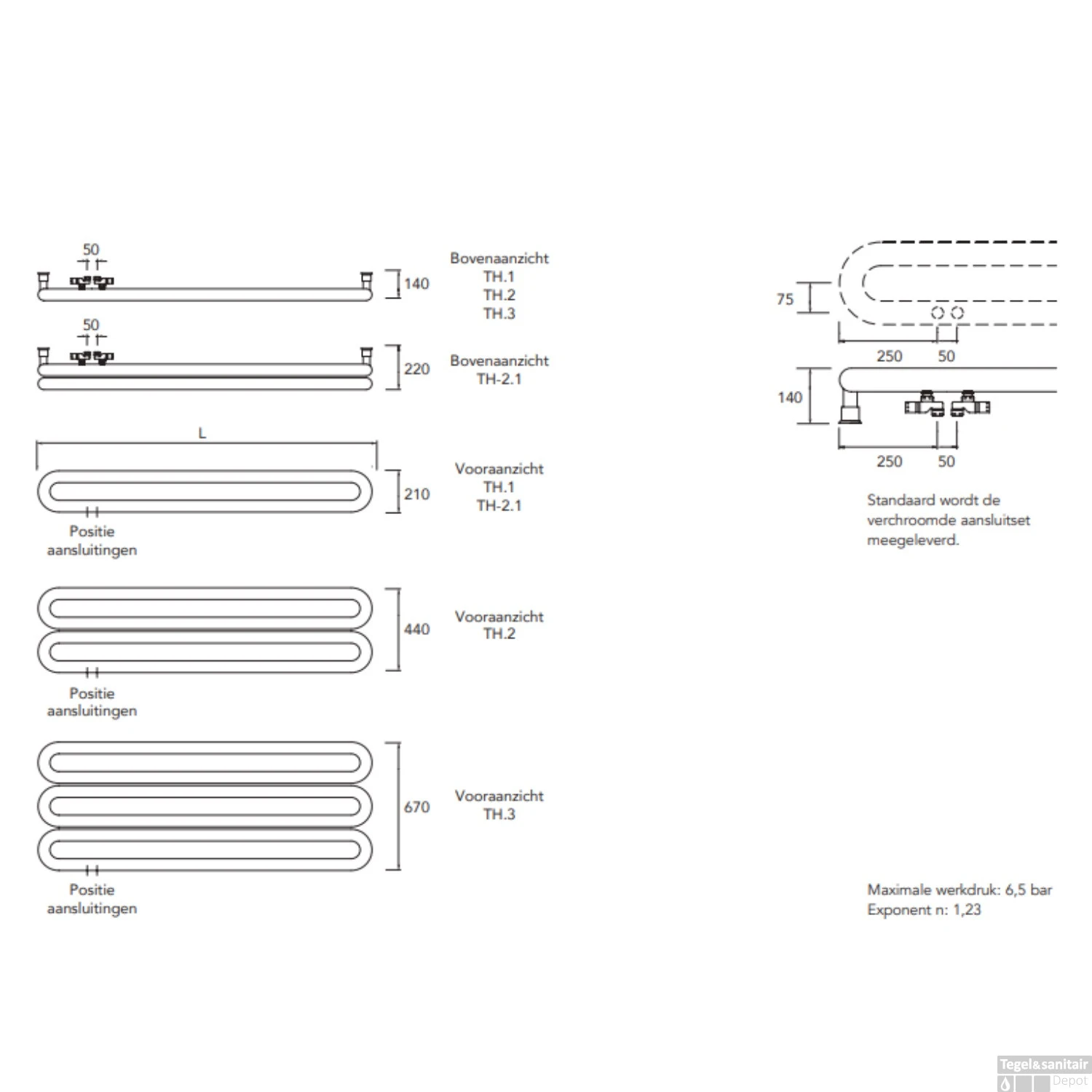 Door de standaard meegeleverde aansluitset is de aansluiting 50mm indien het leidingwerk uit de muur komt. Het ophangmateriaal is in de kleur van de radiator en wordt samen met de ontluchting meegeleverd. De radiator wordt na een grondige roestwerende voorbehandeling voorzien van een poeder-epoxylaag.