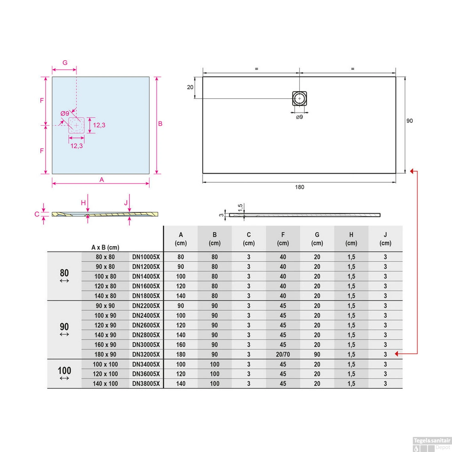 De afmetingen van deze douchebak zijn 180 cm breed en 90 cm diep. De douchebak is 3 cm hoog. Daarnaast is deze douchebak verkrijgbaar in 14 formaten van 80, 90 en 100 cm breed en tussen de 80 en 180 cm diep. Ook heeft u maar liefst 5 jaar (!) garantie op deze douchebak.