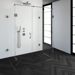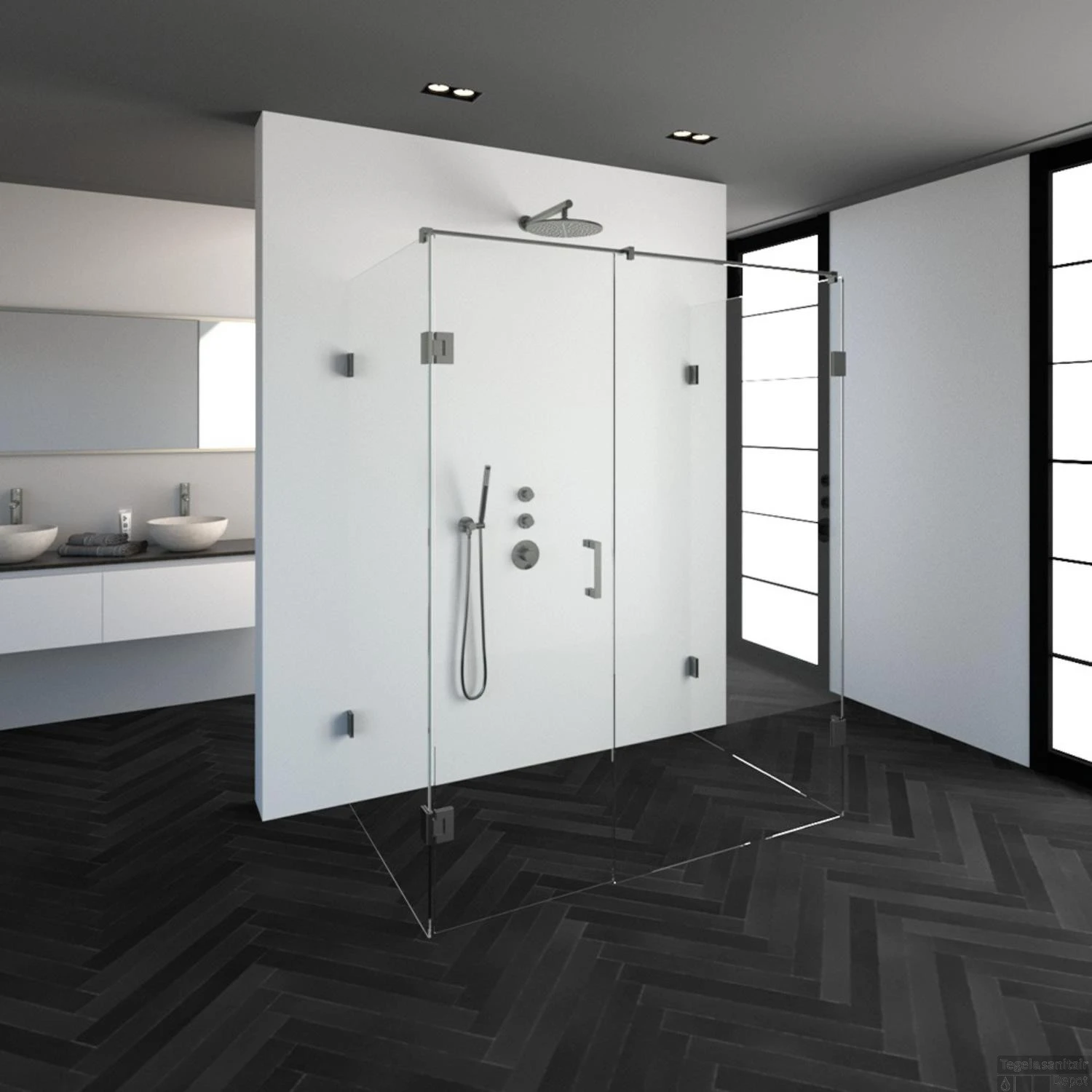 Deze complete douchecabine bestaat uit twee inloopwanden gekoppeld 100 cm, één inloopwand gekoppeld 60 cm en een draaideur 60cm met RVS beslag. Inclusief glasbehandeling en optionele kunststof profielen. De hoogte van de douchecabine is 200 cm. De cabine is 158,8 cm breed en 97,7 cm diep. Deze douchecabine straalt luxe uit door zijn design en kleur.