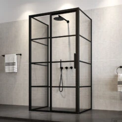 Een moderne douchecabine met een duidelijke knipoog naar de rauwe inspiratie. De zwarte metalen frames zijn gebaseerd op industriële deuren. Nu natuurlijk alleen aan de buitenzijde toegepast, zodat de douche van binnen eenvoudig te onderhouden is. Maar ook de subtiel toegepaste zichtbare bouten zijn een knipoog naar de oorsprong.