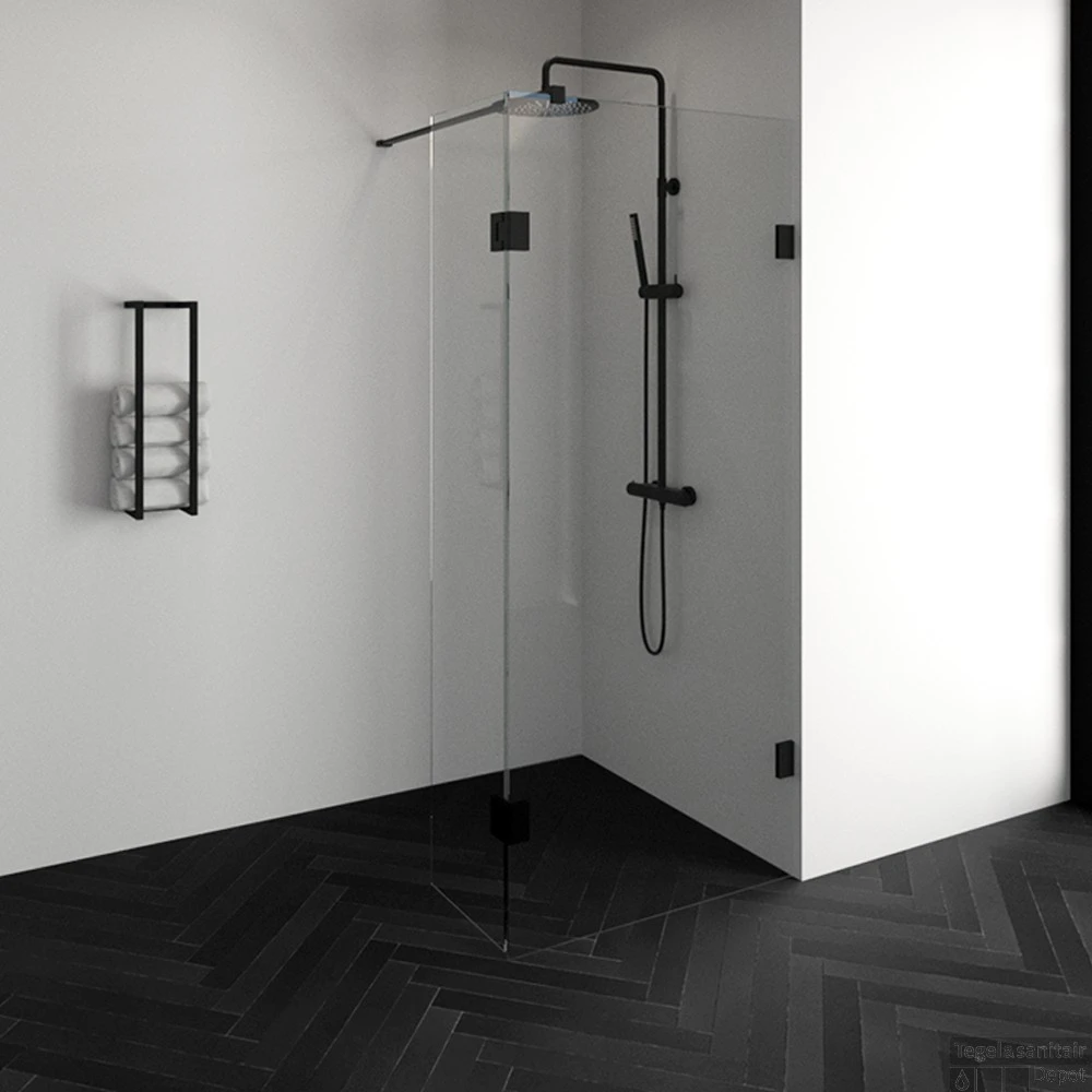 Deze complete inloopdouche bestaat uit een inloopwand en een draaibare zijwand met Mat Zwart beslag. Inclusief glasbehandeling en optionele kunststof profielen. De hoogte van de inloopdouche is 200 cm. Hij is 87,7 cm breed en maximaal 200 cm diep. Deze inloopdouche straalt luxe uit door zijn design en kleur.