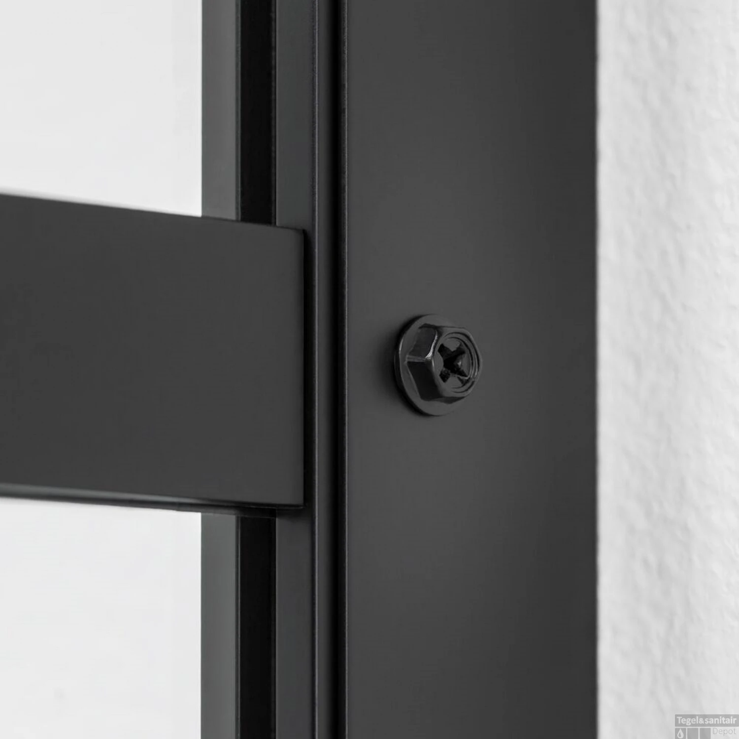 Moderne deuren en inloopdouches met een duidelijke knipoog naar de rauwe inspiratie. De zwarte metalen frames zijn gebaseerd op industriële deuren. Nu natuurlijk alleen aan de buitenzijde toegepast, zodat de douche van binnen eenvoudig te onderhouden is. Maar ook de subtiel toegepaste zichtbare bouten zijn een knipoog naar de oorsprong.