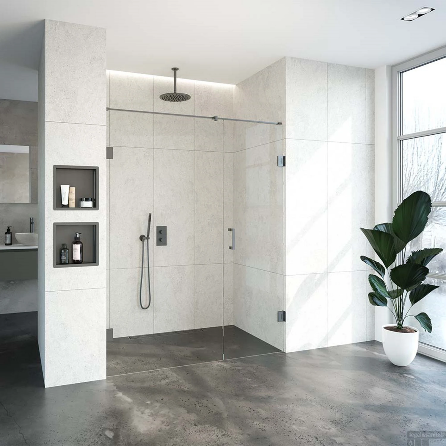 Deze complete nisdeur bestaat uit een inloopwand en draaideur met Gunmetal beslag. Inclusief glasbehandeling en optionele kunststof profielen. De hoogte is 200 cm. Deze nisdeur straalt luxe uit door zijn design en kleur.