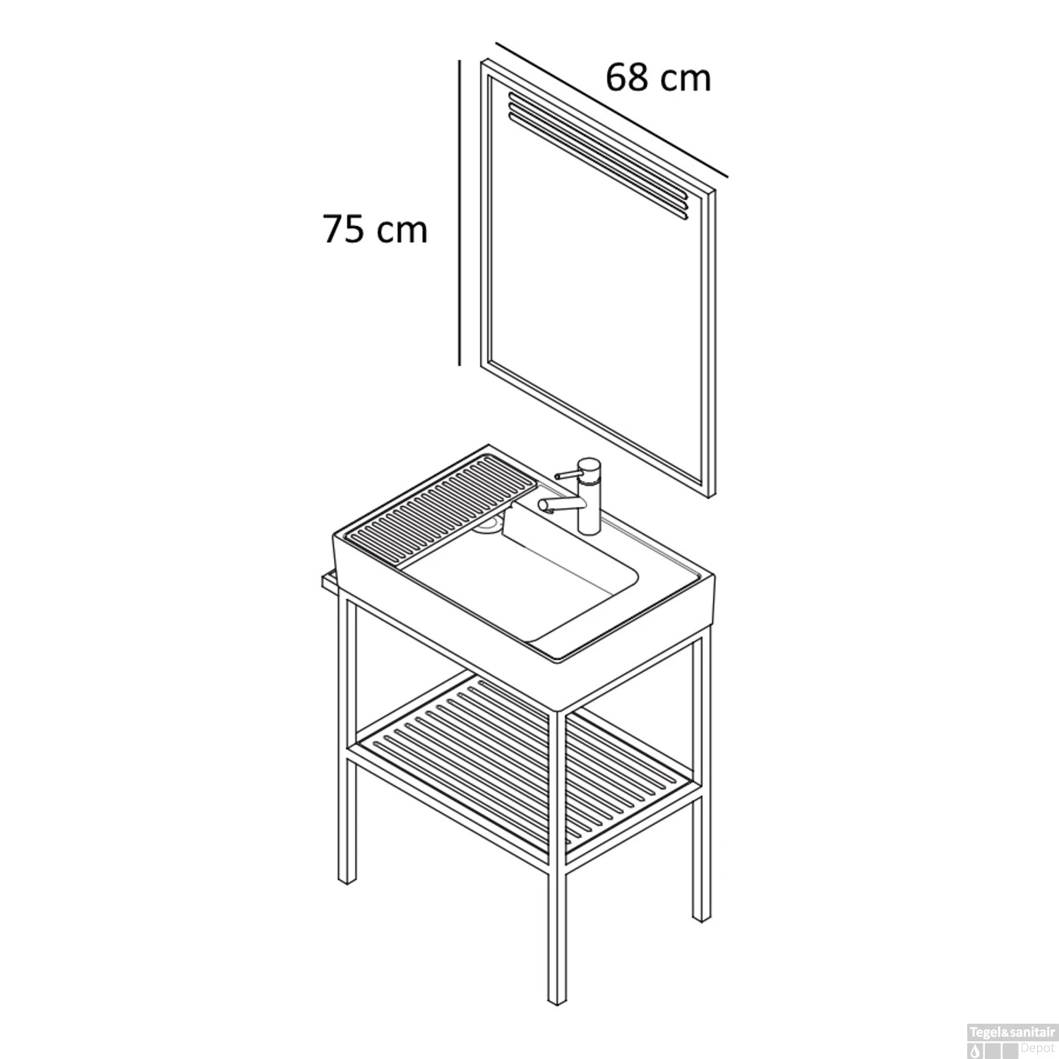 De spiegel is 75 cm hoog en 68 cm breed en uitgevoerd met een mat zwarte frame.