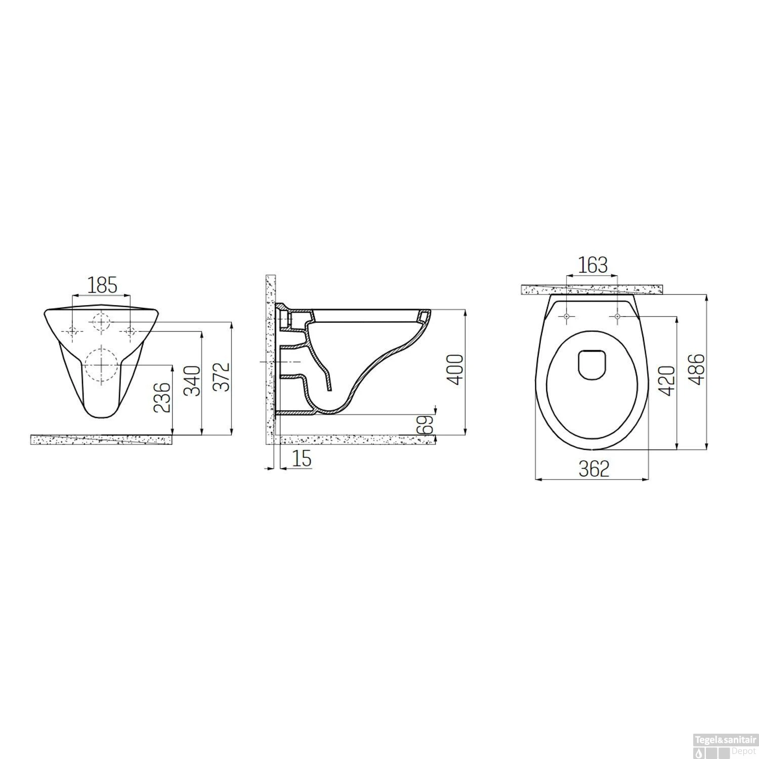 De diepspoelwandcloset heeft een diepte van 48,6 cm, een breedte van 36,2 cm en een hoogte van 40 cm.