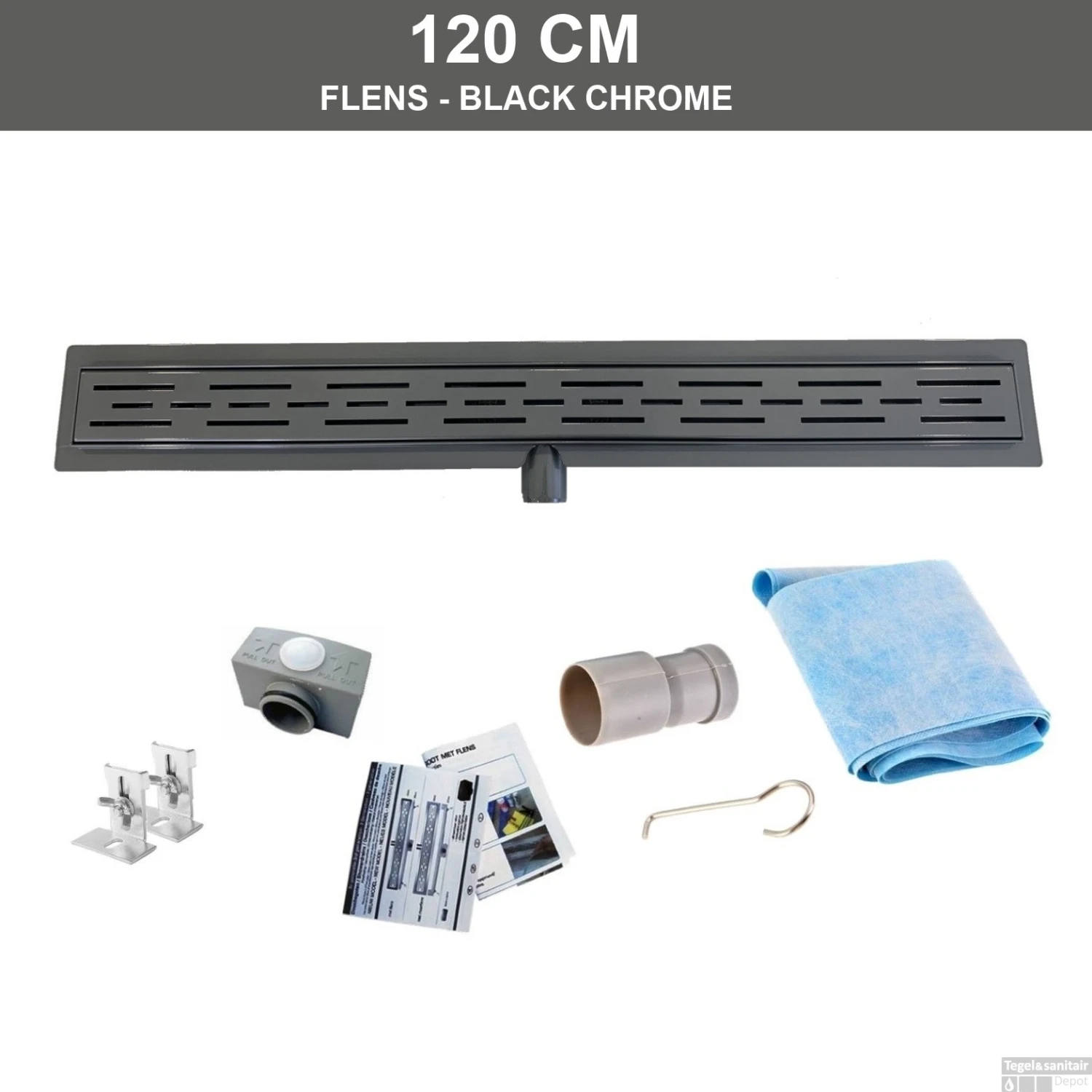 Zwarte Chromen RVS Douchegoot Flens met Uitneembaar Sifon 120x7cm 6,7cm Diep BLACK CHROME ROOSTER